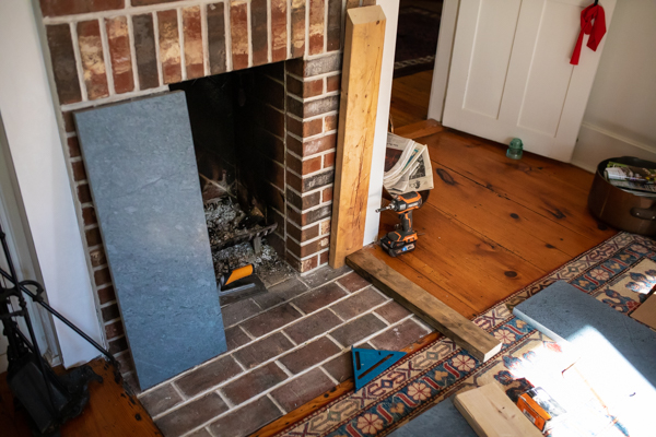 The first step is to measure the legs from the hearth to the top of the firebox. If the hearth and fireplace opening is level the dimensions should be the same. If not, cut your two pieces to that the top soapstone piece will sit level. You may need to drop the soapstone down past the top of the firebox a small amount to accomplish this.