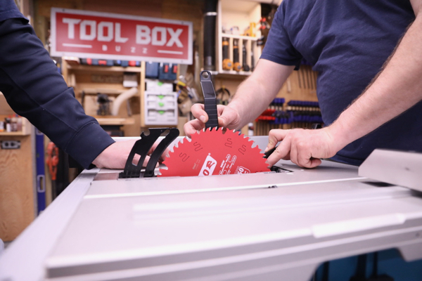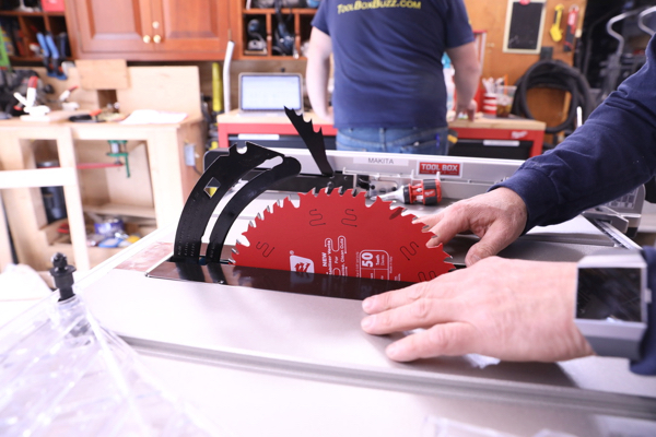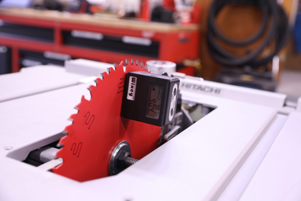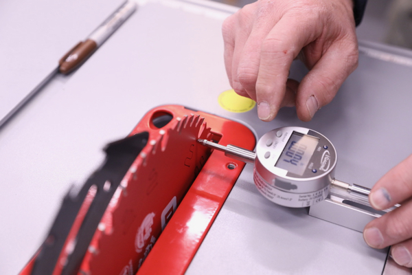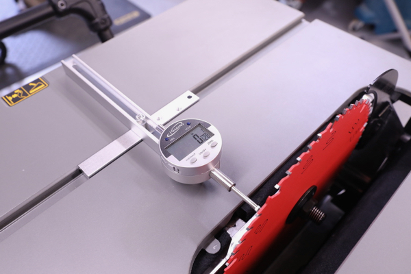 Mark a reference point on the blade on a reference tooth and rotate the mark to the front of the table. TBB used a dial indicator for the following measurement. You may read about and build a homemade jig or fixture to perform the following procedure, But for the H2H test, TBB wanted as accurate a measurement as possible. We used an gauging Dial Indicator that was good to .0005”.