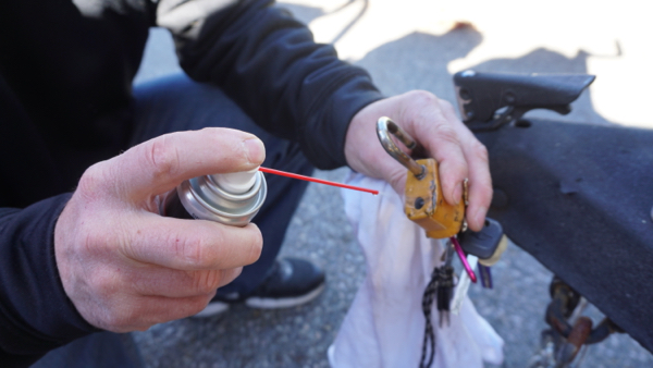 Desperate I grabbed a can out of my house and was able to free the frozen lock. Looking back I never cleaned or lubricated my locks and I’m sure they were full of moisture holding debris that seized my lock.