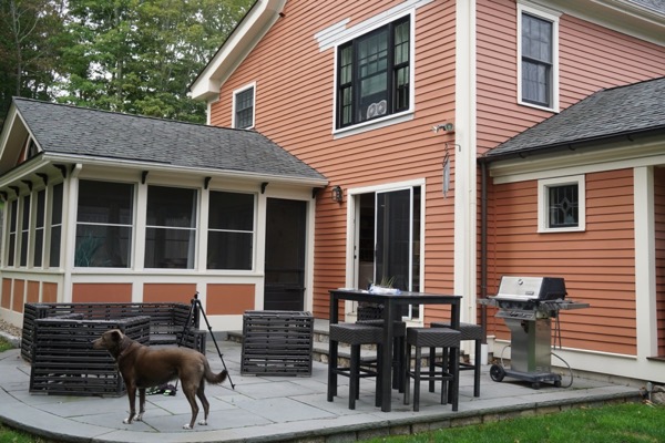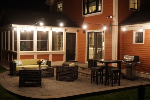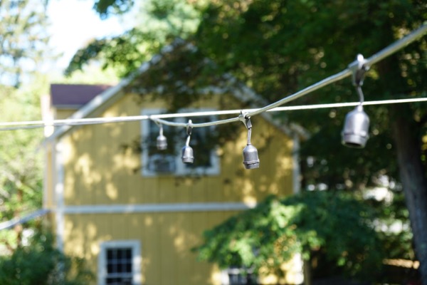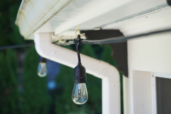 I then ran the string lights back to the other house wall and attached a bulb to an eye-hook with a stainless steel carabiner.
