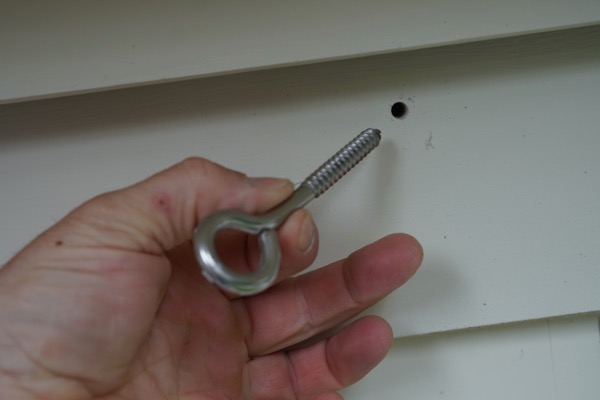 Install the eye-bolt into solid framing, if possible. When looking at the house fascia, I looked for the trim nails indicating the location of a rafter tail. [solid framing to install into] I visually verified this rafter tail location by peeking up through the sofit vent.