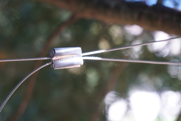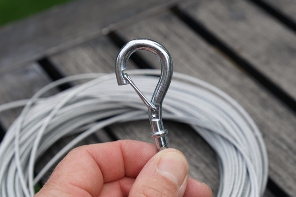 The Globe Light Suspension Kit cable comes with a snap hook on one end and a “Gripple Fastener.” The Gripple Fastener allows the cable to be inserted the fastener, looped around an object and then returned and looped through again for a secure attachment. This Gripple fastener acts as a tensioning and allows you to make tightening adjustments. I chose a sturdy branch to wrap the cable around. In order to protect the tree branch from being damaged I used a flexible rubber hose I had left over from a another project to act as a protective sleeve.