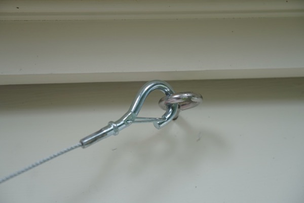 The easiest way to attach the cable is to attach the snap hook on the cable to an eye bolt, installed into the fascia area of the house.