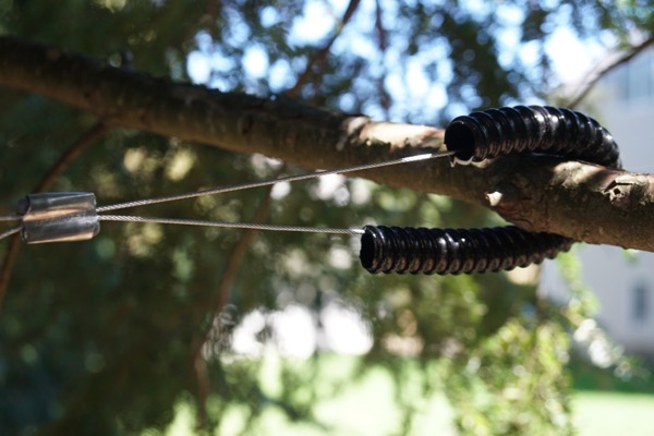 TIP: An old garden hose, or a rubber washing machine hose is inexpensive and works great as a protective sleeve. I left plenty of room in the cable loop for the branch to increase in size. Be aware that even using a protective hose, as I mentioned, will damage the tree long term.