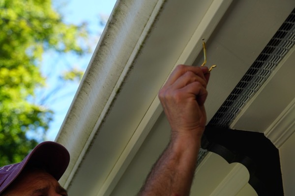 TIP: I used a zip tie to secure the first bulb to the snap ring at the house eyebolt. This would later allow me to pull the string light taut as I worked.