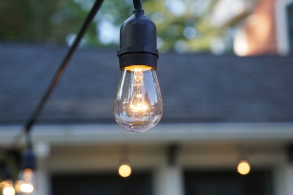 For my project, I started my string lights near an outdoor, weatherproof outlet. I connected the string lights to this outlet with a 12-guage, weatherproof 10-foot extension cord.