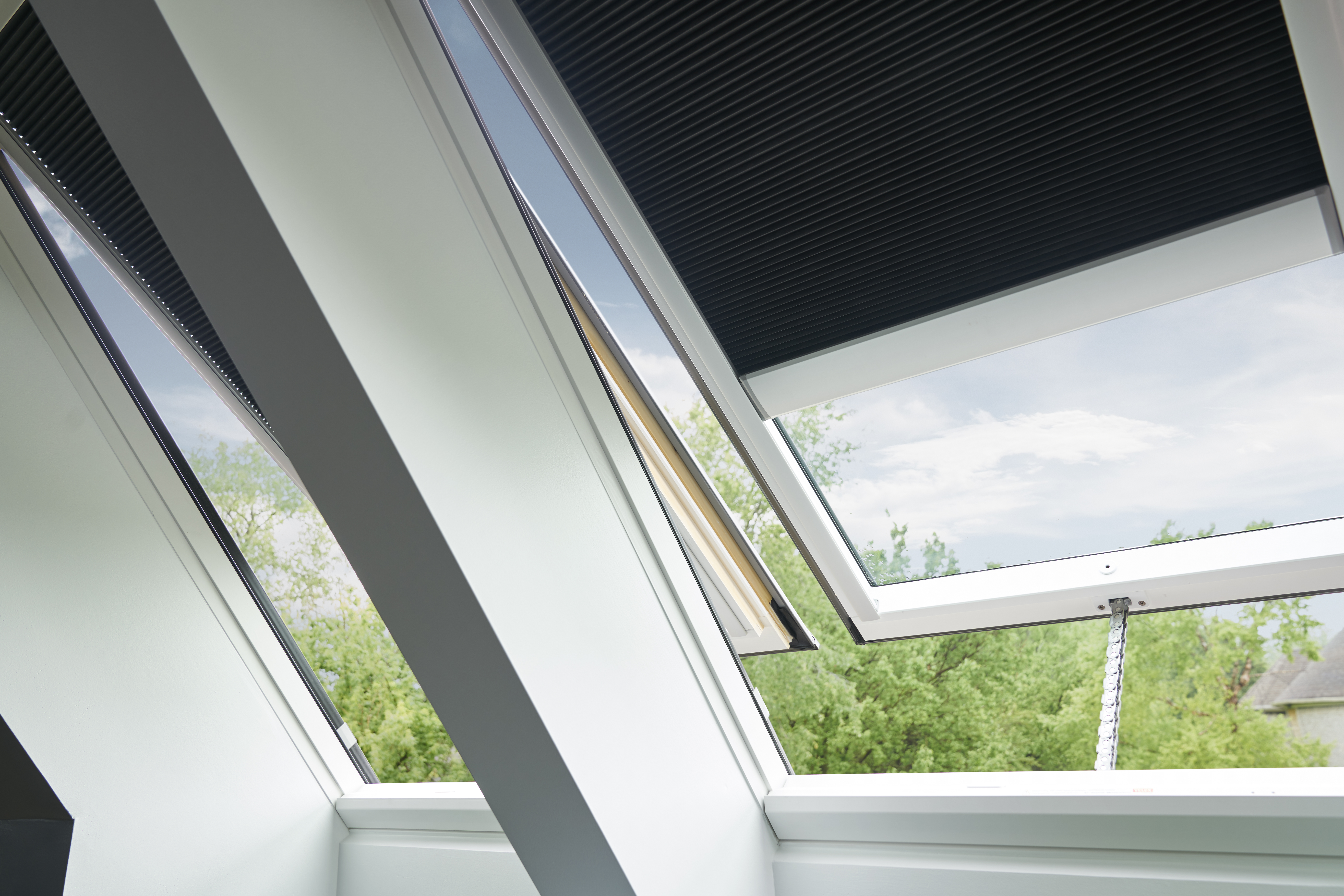 The solar powered skylight uses a small solar panel on the roof exterior to capture available daylight and charge a small, concealed battery. Even on cloudy days, the solar panel will continue to charge. If your skylight is open and it begins to rain a built in rain sensor will automatically close your skylight.