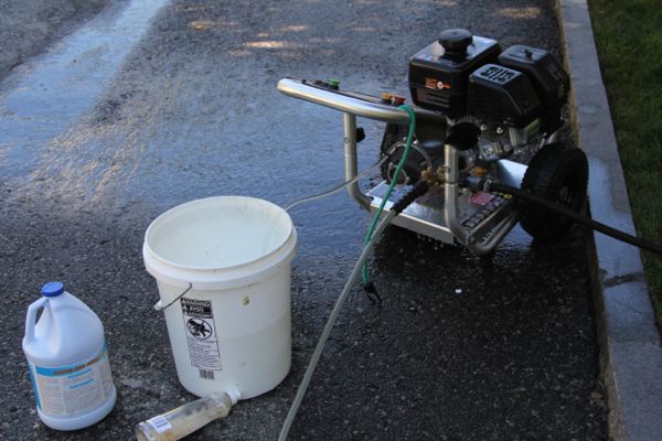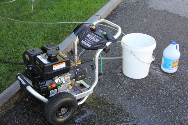 The pressure washer we use siphons 1-gallon of solution to 7-gallons of water sprayed onto the house. We try to keep the spray nozzle 3 to 4 feet from the siding surface to prevent etching or damage.