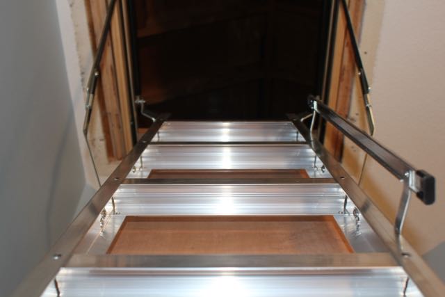 Some of the key features on the Werner AE2210 Energy Seal Attic Ladder include a 6” frame, [which allowed us ample room to install foam spray insulation around the frame after insulation], insulated door and air-lock design, two gas struts and non-marring ladder feet and slip-resistant steps which help ensure operator safety.