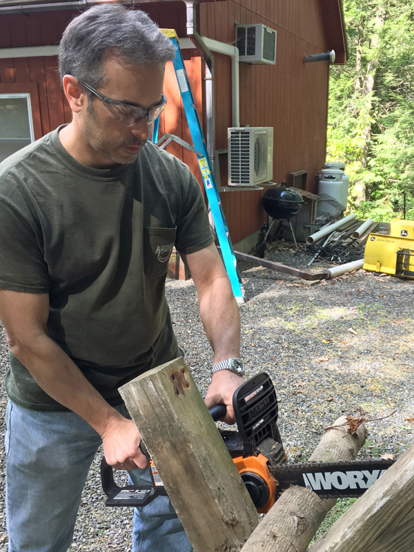 None of these tasks require a pro-level, turbo-charged, jet fuel-powered, 450 HP saw with an eight-foot bar (just kidding), designed to be used (not kidding) continuously for eight hours a day, 260 days a year. An inexpensive cordless chain saw will fit the bill just fine. You really want cordless because these are pretty much “add chain oil and go” tools. A gas chain saw not used and maintained regularly can be finicky to start, especially if it’s been sitting for a while. You don’t want to be trying to impatiently start one in any kind of odd position or location, and certainly don’t want inexperienced people doing so — they increasingly get themselves into more and more unsafe positions as they pull repeatedly, with increasing frustration, on the cord. With electric saws by contrast, you just pull the trigger. Electric saws require a whole lot less maintenance than gas saws, and need fewer tools in the field. They don’t have engines, carburetors, throttle plates, chokes, and so on. But corded chain saws, while easier to use than gas ones, have an extremely inconvenient and often unsafe long cord to deal with. Cordless is the way to go, with the added benefit that they are quiet — often no ear pro is necessary.