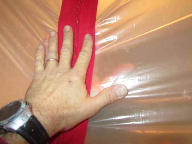 I erected my dust containment barrier wall first then installed the zipper. To do this I had my partner place his palm as opposing pressure as I applied the self sticking zipper. Once we cut the plastic I ran my fingers up and down both sides of the zipper to help the adhesive stick.