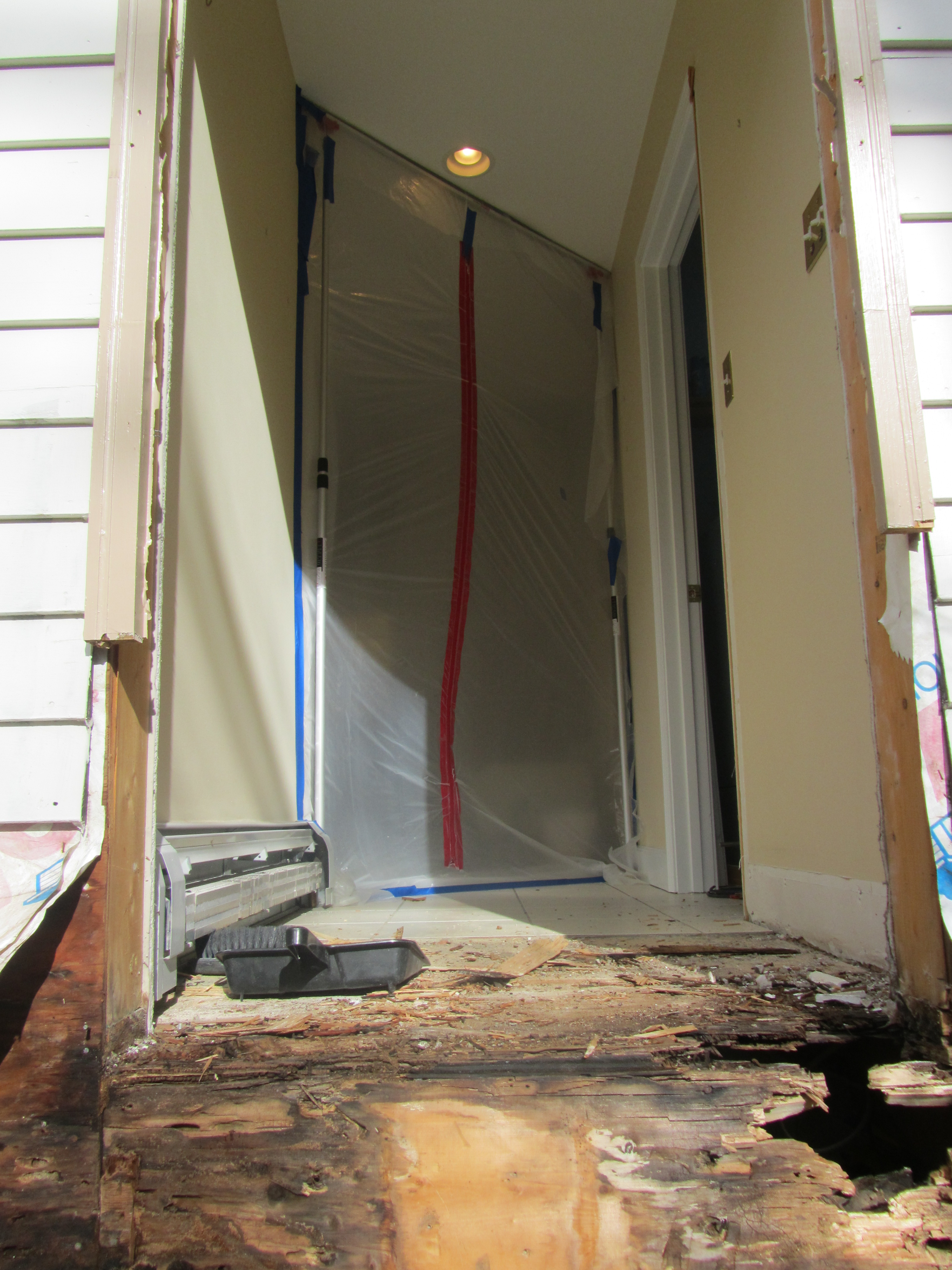 The area we were working in also had the only first floor bathroom and the laundry room and we wanted to be able to allow the homeowner access after hours. Areas adjacent to this work had priceless butterfly and insect specimens displayed all over the house and we were nervous of dust getting out of our plastic barrier.